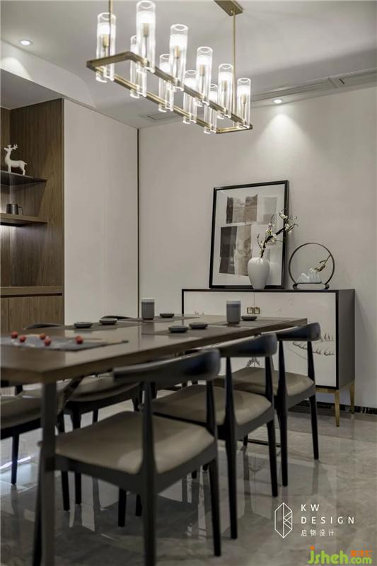 胡桃木餐桌,黑色和米灰色交織的椅子顏色之間的碰撞,層次豐富,布局從容,相互表達出敬意。令人溫暖的燈光,仿佛在等待家人的回歸。室內(nèi)設計師