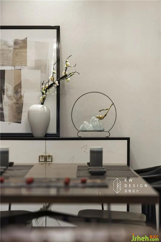 這種基調(diào)延伸到餐廳,將收納柜的側(cè)邊設計成展示柜,現(xiàn)代和古典氣質(zhì)交織融為一體,心中開始涌動起了詩意,有了想敘事的心思,也便有了停頓和思考。