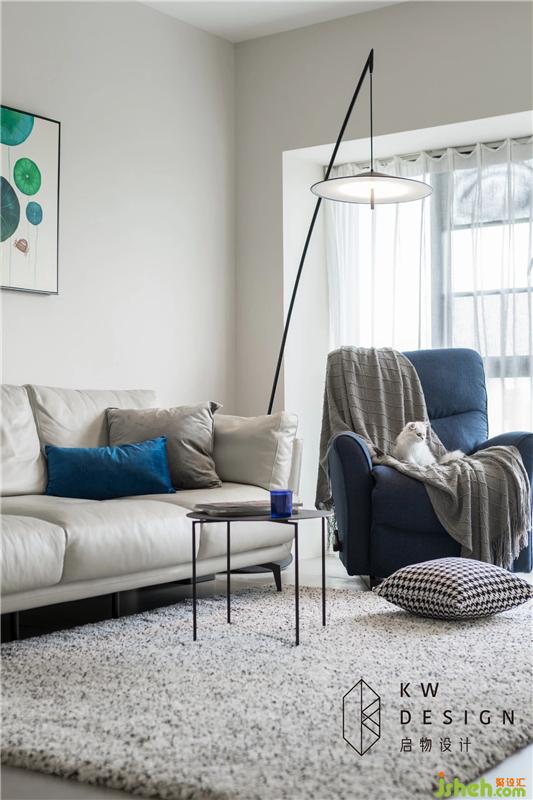 湖藍色功能沙發(fā)滿足兩位屋主躺著冥想和看書的愜意享受。也是貓咪最喜愛的角落。黑色弧形釣魚燈與邊幾互相呼應,線與面,直與彎,構(gòu)成空間和諧的秩序之美。裝修設計