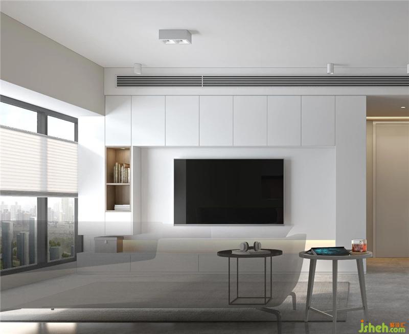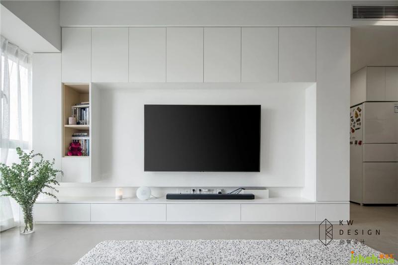 空間的大部分橫梁結(jié)構(gòu)和中央空調(diào)藏在吊頂里,白色簡約吊頂與白色的柜子拉伸了整體空間高度,并不會覺得壓抑。電視柜采用中間以及左下方鏤空的形式打造輕盈簡約的視覺效果,橡木色開放格做點綴豐富層次感。功能上開放格滿足使用頻率較高的書籍收納,下方的抽屜擺放零碎的家居物品,方便拿取。平開門柜子做書柜儲物柜功能使用。
