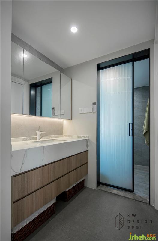 衛(wèi)生間用長虹玻璃做功能分離,不影響采光的同時也能很好的滿足屋主的衛(wèi)浴享受。即使在未來人員增加的情況也能滿足順暢的起居習(xí)慣。粗狂的石材紋路搭配細(xì)膩的木材紋理打造簡約浴室柜。鏡柜和懸空位置的收納籃都可以做到很好的儲物,保證空間整潔美觀。海淘回來的漢斯格雅的龍頭及潔具各司其職,為主人提供高品質(zhì)生活。