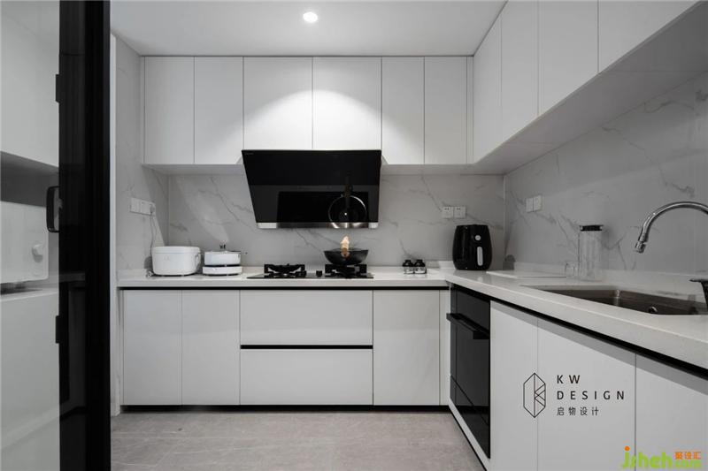 L型的白色廚房,將儲藏、洗滌、烹飪等功能設(shè)計的更加簡潔和隱蔽。通鋪的霧面深灰色瓷磚,帶粗狂的灰色紋理的爵士白墻磚,黑色的隱形拉手和電器共同打造了這個簡約卻功能十足的廚房空間。