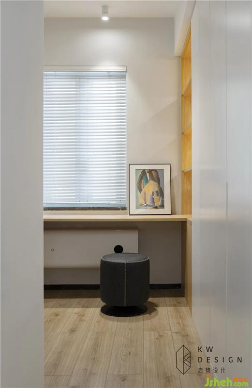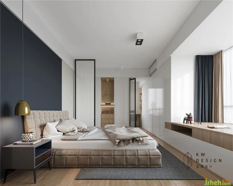 床尾的飄窗位置做了和窗臺一樣高度的儲物柜,加深飄窗平臺的深度達到一米,形式一個臥榻,打造一處主人看書休閑的愜意角落。同時用木色做漸色和延伸使飄窗柜和衣柜連成一體,增加儲物空間同時兼具美觀的視覺效果。