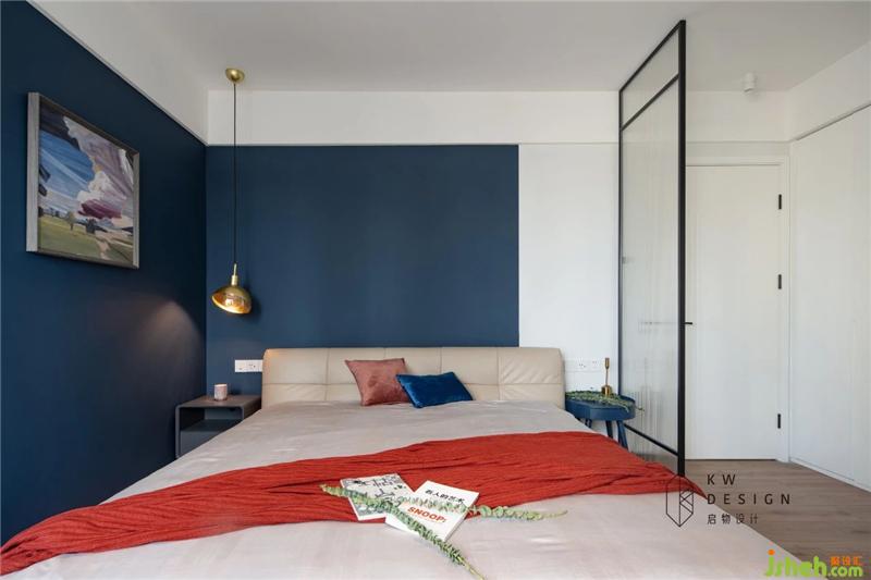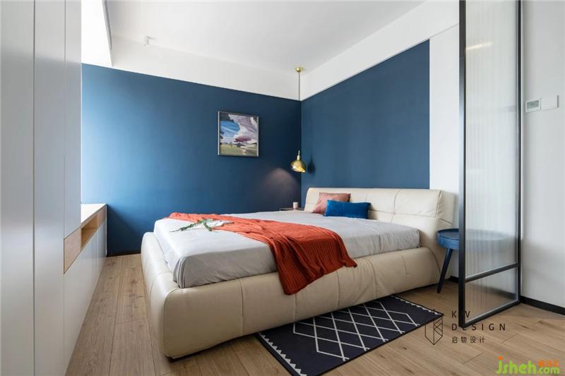 不同于藏藍的沉穩(wěn),淺藍的稚嫩,背景墻刷的琉璃藍,特有的質(zhì)感,給人一種疏離的美感,舒服優(yōu)雅。床頭背景采用分色的形式,讓空間產(chǎn)生比例美感,造型簡約的床頭采用超纖科技布,搭配會呼吸的床墊,為屋主提供時尚舒適的休憩空間。
