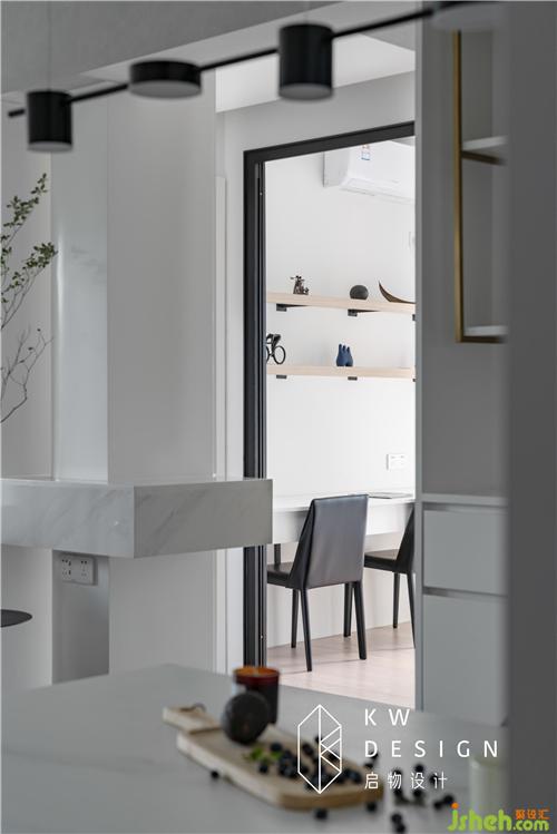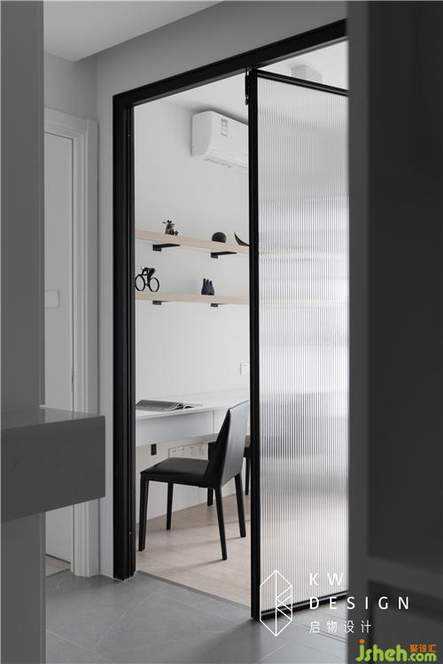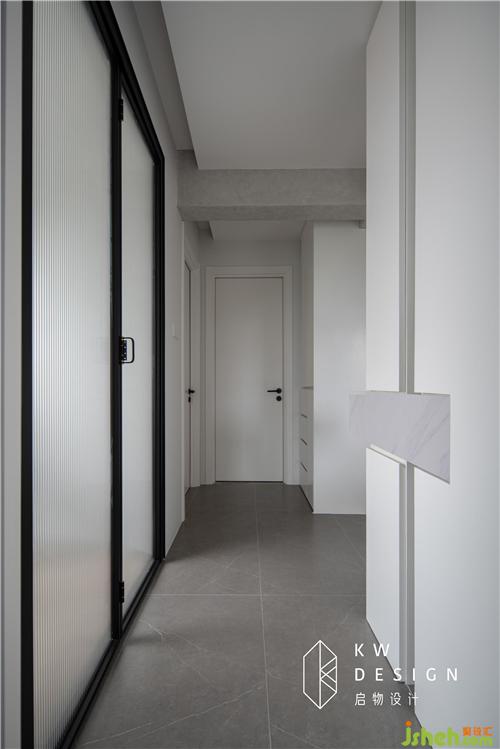 拉手長(zhǎng)虹玻璃門(mén)可隔離亦可增加空間互動(dòng),將光線引入過(guò)道,光影變換時(shí)常在這里上演。