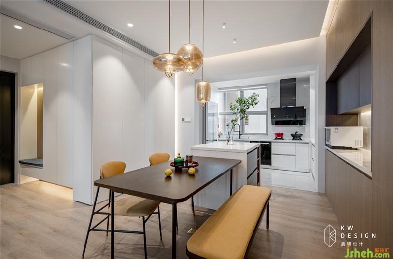 吧臺作為一個輕食臺和餐桌高低結(jié)合,組成一個方便別致的聚餐區(qū)。同時滿足少人和多人的進食需求。吧臺底部和背后柜體及鏤空部分均具收納功能。