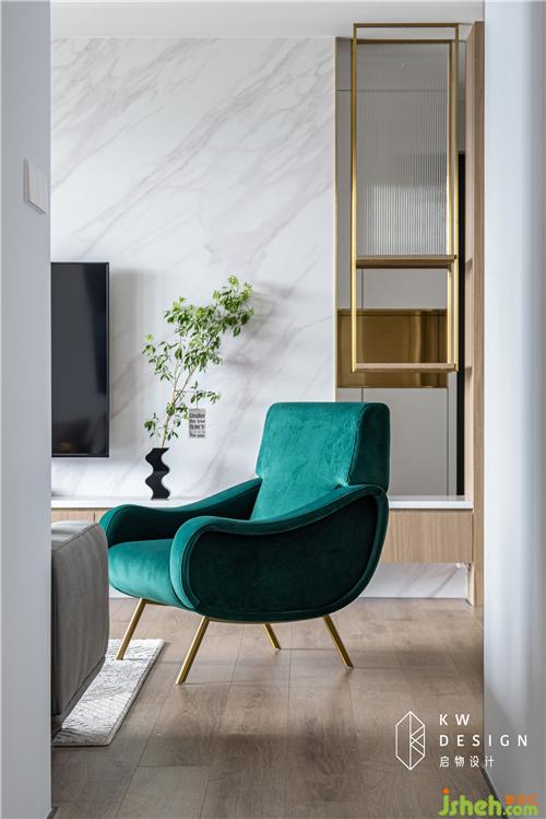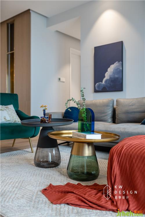 而藍、綠、紅抱枕飾品、米咖、金色玻璃拼接茶幾、丹麥同色系異形花瓶等的采用既增添色彩活力,又讓客廳具備滿滿設計感和新鮮度。