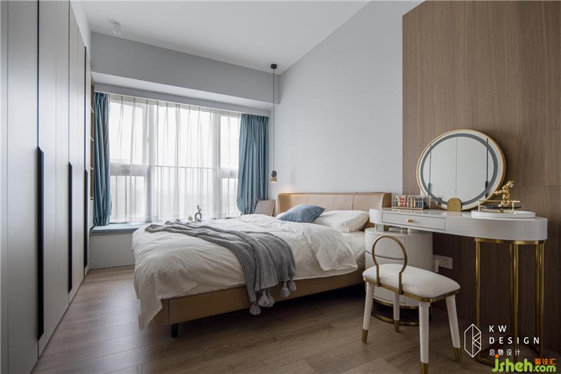 臥室整體偏簡約溫馨。皮質(zhì)木色大床,搭配木質(zhì)墻柜,木式墻面從梳妝臺一直延伸至相鄰墻面,打造視覺延伸感,打破白色墻體的單調(diào)沉悶。