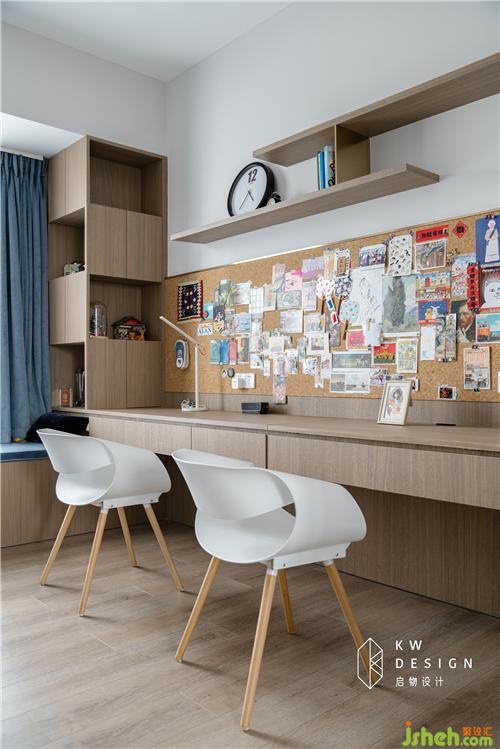 因為男女主喜歡旅游和攝影。設計師特地設置了一個軟木板的墻面,可以用圖釘將大大小小的照片定格在墻面展示。無限組合,循環(huán)使用。