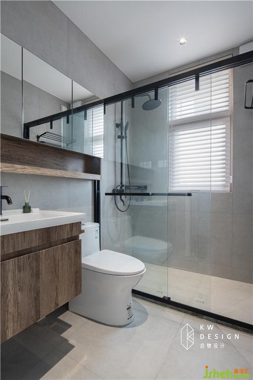 衛(wèi)生間干濕分離,整體整潔利落。同時采用木質(zhì)柜體,百葉窗,暖色照明燈等增添洗浴空間的溫馨放松之感。