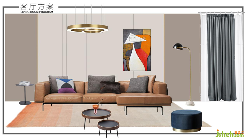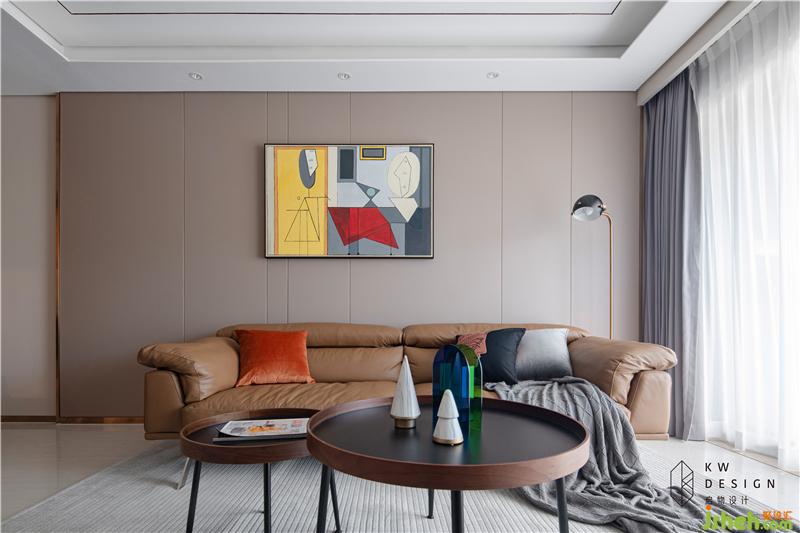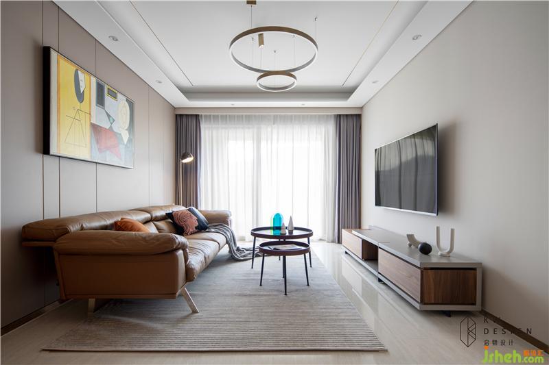軟裝方案:室內(nèi)設(shè)計(jì)師結(jié)合輕奢和簡約風(fēng)格元素,搭配簡約輕巧型家具。棕橙色皮質(zhì)沙發(fā),上下呼應(yīng)的大小圓形組合拼接的吊燈和茶幾,極簡線條金屬落地?zé)簦钆渌厣昂熀偷靥?,使整個(gè)空間靈動(dòng)活潑。