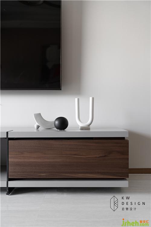 室內(nèi)設(shè)計(jì)師取消電視背景的木飾面,刷上暖咖色乳膠漆,搭配簡約胡桃木+烤漆灰電視柜。