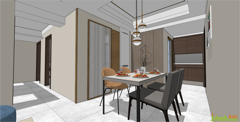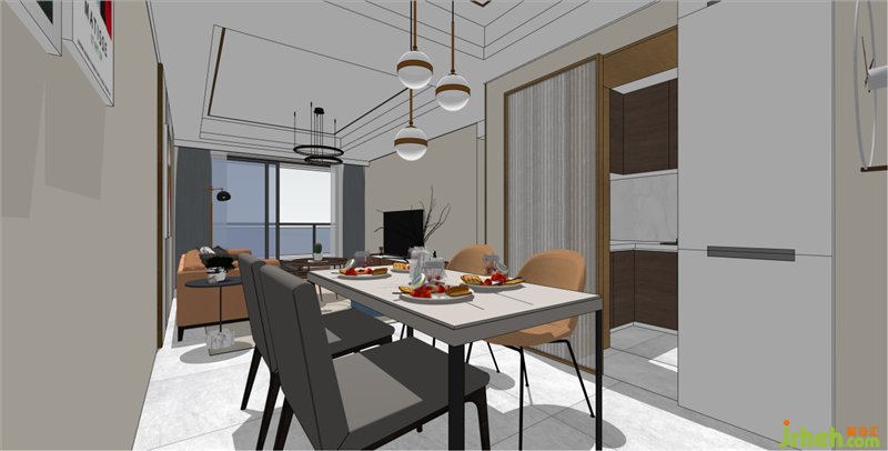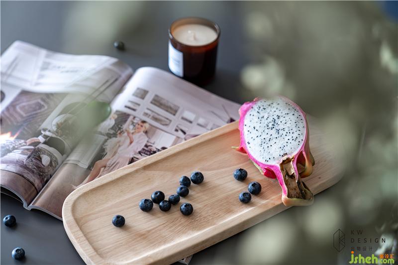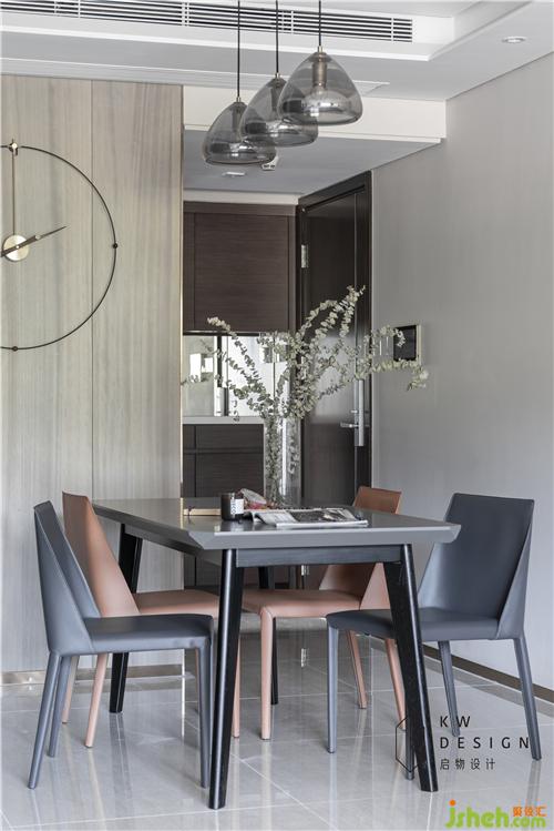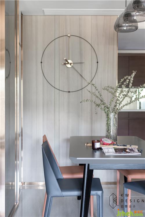 軟裝方案:丹麥nomon掛鐘,淺色吊燈,深灰色餐桌,拼色餐椅和掛畫豐富空間色彩。