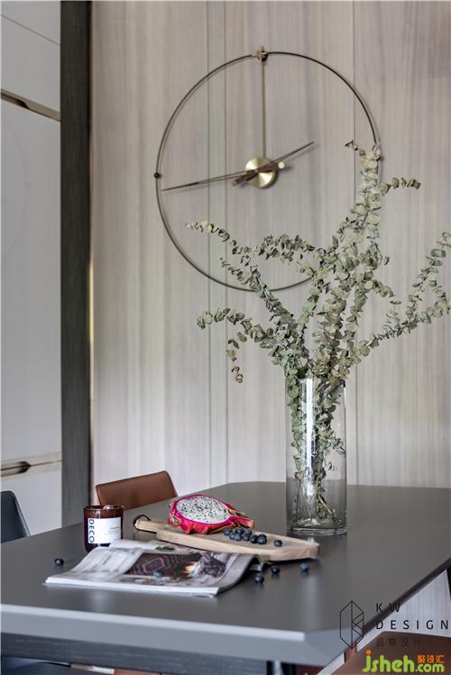 延續(xù)空間金屬元素,木飾面金屬邊框收邊,抽縫增加立面線條感。搭配簡約掛鐘,符合美學(xué)定律的裝飾面讓空間頓時(shí)雅致起來。