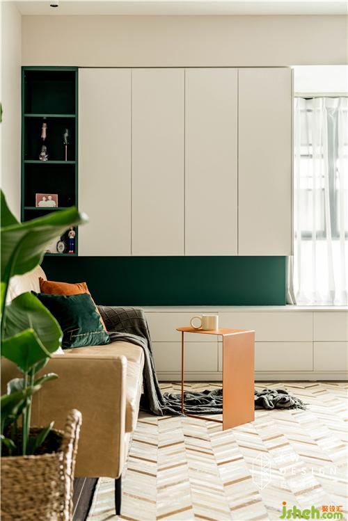 考慮進(jìn)門(mén)玄關(guān)直通客廳并沒(méi)有做隔斷柜,直接就能看見(jiàn)陽(yáng)臺(tái)這面墻,半墻刷了高雅的墨綠色搭配白色儲(chǔ)物柜和開(kāi)放展示格做端景柜,室內(nèi)設(shè)計(jì)師結(jié)合半邊窗外的風(fēng)景營(yíng)造一幅動(dòng)靜合一的優(yōu)美畫(huà)面,給人入門(mén)眼前一亮的感覺(jué)。