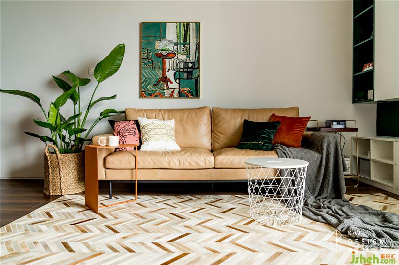 復(fù)古焦糖棕的雙人沙發(fā),愛(ài)馬仕橙的簡(jiǎn)約邊幾,暖棕拼接式牛皮毯,景觀效果極佳的鶴望蘭,室內(nèi)設(shè)計(jì)師和整個(gè)空間元素互相呼應(yīng)協(xié)調(diào)統(tǒng)一的裝飾掛畫(huà),每一處細(xì)節(jié)無(wú)不彰顯屋主的生活態(tài)度和品質(zhì)享受。