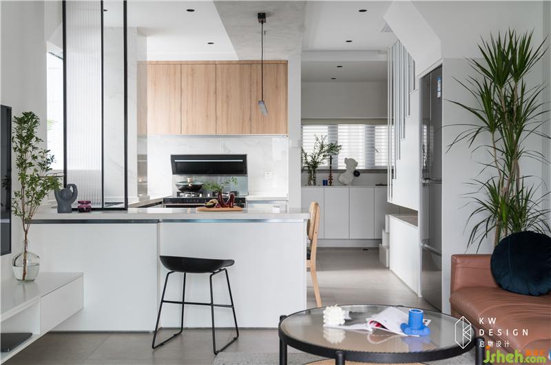 3.U字形開放廚房增加餐廚收納功能,靠近客廳一邊做輕食區(qū)和吧臺功能,連接定制的1.2m餐桌,無論是二人世界還是朋友聚餐大平臺完全滿足,利用率最大化。