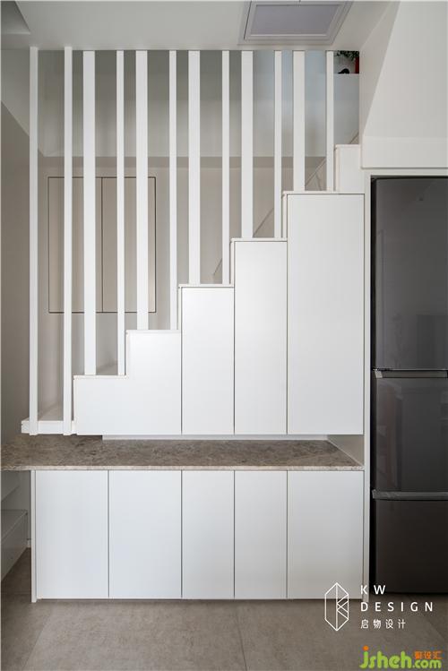 功能置換之后,取消墻體,餐廚空間與客廳以吧臺和長虹玻璃作為分隔,樓梯下空間作為餐邊柜使用,同時嵌入冰箱,讓用餐空間及儲物空間協(xié)調規(guī)整。