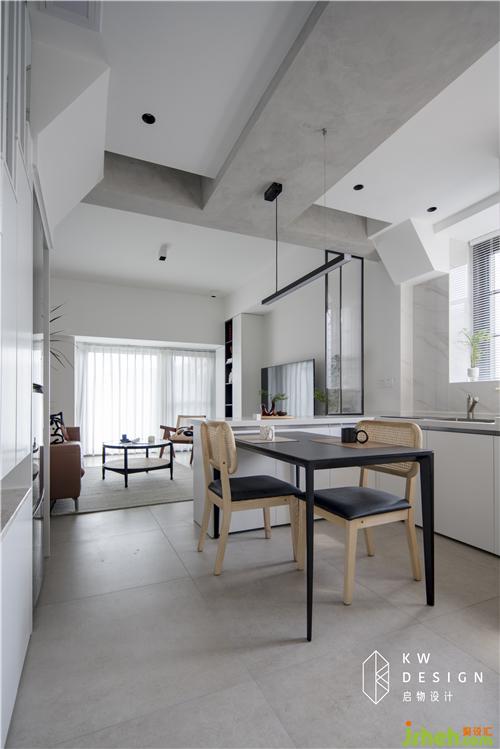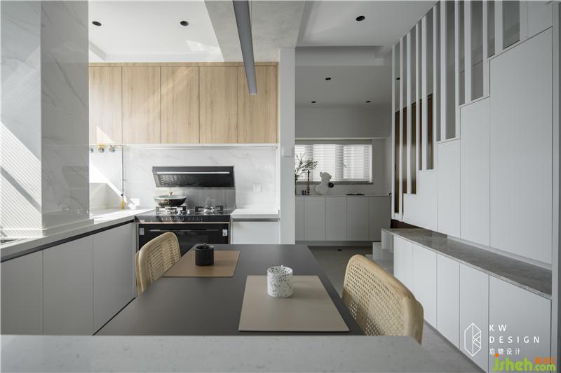2.只有衛(wèi)生間與廚房空間互換,功能動線才能達到最佳,還能完成互動性極強的LDK一體化空間。室內(nèi)設計師因為新房主要是Miss Z和MR L兩人居住,一樓衛(wèi)生間決定取消淋浴功能,只做干區(qū)使用,把更多空間留給廚房和餐廳。1.3m開間滿足兩人日常進出使用習慣,用隱形門弱化此功能區(qū),讓一樓呈現(xiàn)更加開放完整的公共空間。