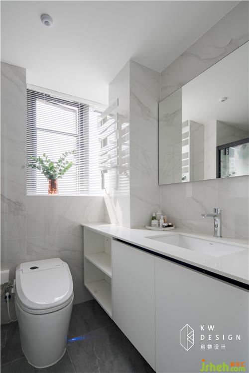 貫穿上下的煙道位置定制淺柜連接浴室柜,整體美觀,開放格可以放置隨手可拿的生活用品。