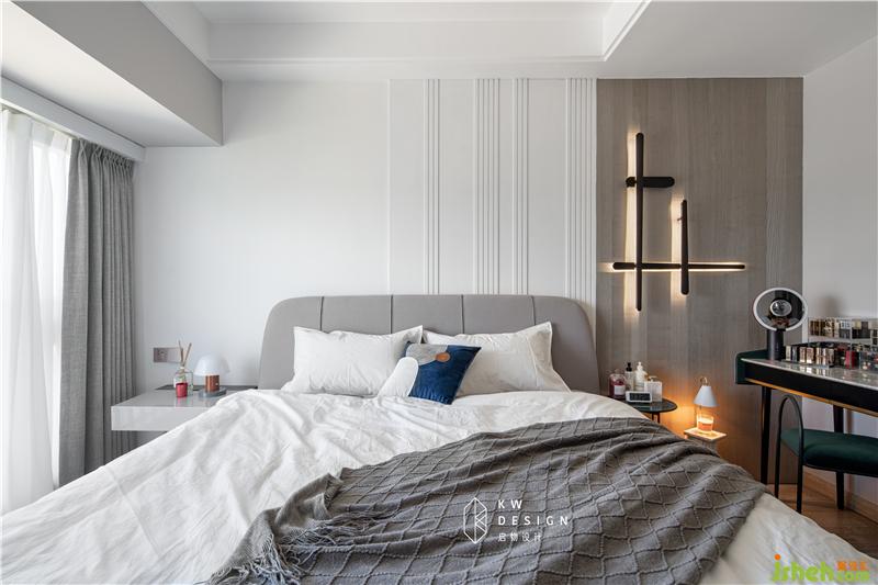 床頭背景是白色木柵格+白栓木飾面墻的結(jié)合,木柵格是某寶采購回來,粘在基層板上再刷白色漆,完成面和木飾面厚度統(tǒng)一,都是12mm。搭配黑色復(fù)古長條十字壁燈,線條感和設(shè)計感讓簡約的臥室空間不簡單。