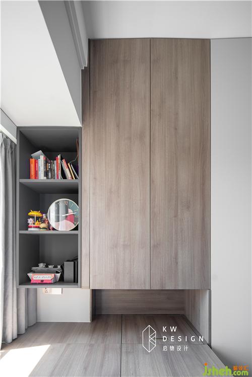多功能房采用深色沉穩(wěn)木色和亮白色面板做拼色設(shè)計,灰色開放格點(diǎn)綴。超大收納空間,Kelly可以放肆海淘了。