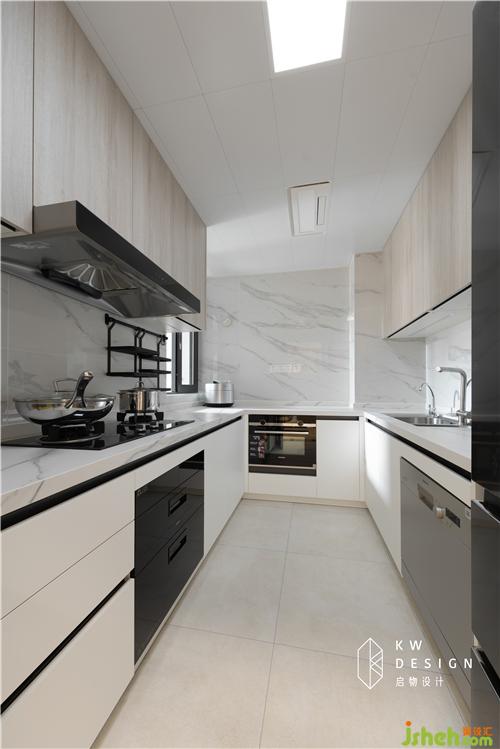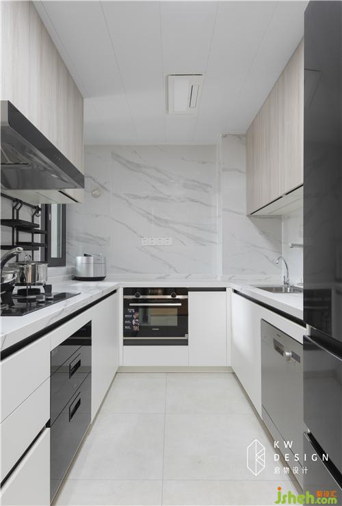 封掉進(jìn)陽臺的門,廚房做u字形,利用率達(dá)到最高。整體配色以簡潔為主,淺木色配白色,臺面用耐高溫好打理的巖板,柜子還是統(tǒng)一的無拉手無頂封板設(shè)計。