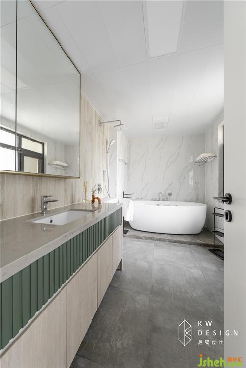 懸空浴室柜方便清潔打理。靠淋浴區(qū)這邊臺面落地,可以防止洗浴時濺到水影響柜子使用壽命。