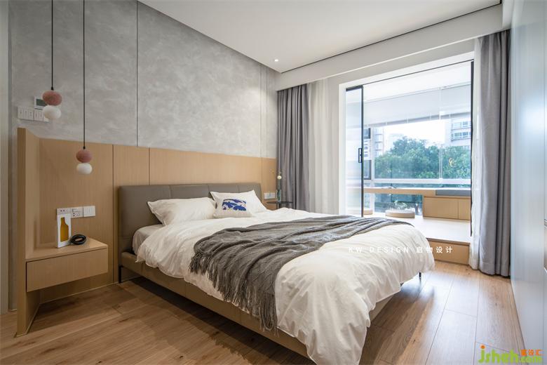 1. 進門右邊空間設(shè)為舒適好用的主臥大套間,衣帽間與三分離衛(wèi)浴作獨立換洗區(qū)。深圳家裝設(shè)計睡眠區(qū)床尾梳妝臺連接衣柜作收納補充。陽臺增設(shè)地臺作多功能陽光房,沿窗設(shè)置可坐可書寫平臺,地臺通鋪至客廳電視墻與公領(lǐng)域行成洄游動線,功能又各自獨立,打造可靜可動的靈活場景。