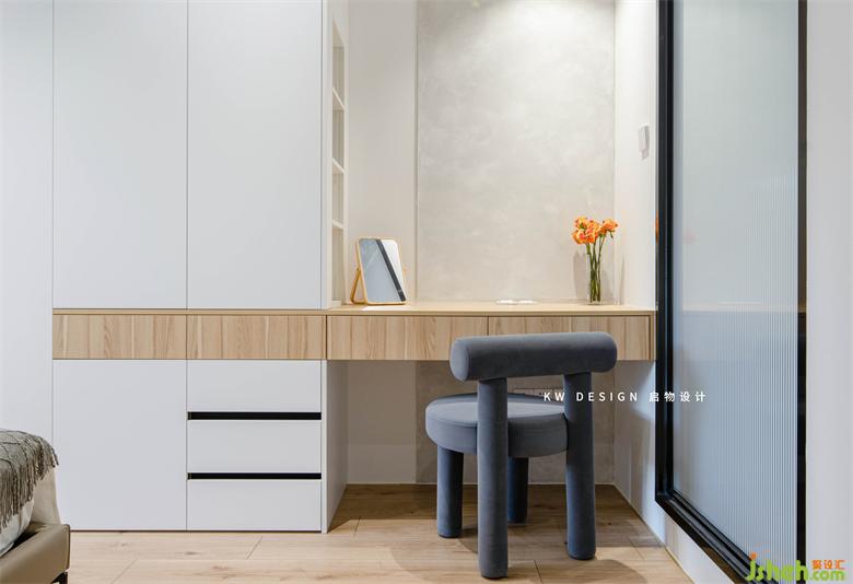 對(duì)著公共空間的梳妝區(qū)域,墻面做了一塊水泥藝術(shù)漆與白墻區(qū)分開,彷如一幅抽象裝飾掛畫,搭配花束與光影,成就一處別致端景。