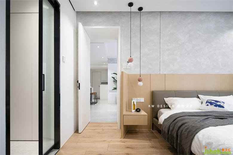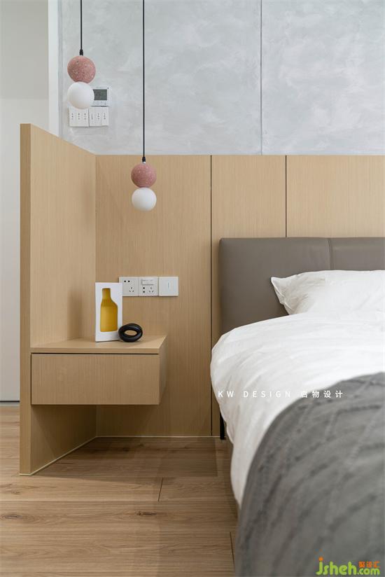 水泥灰與溫潤(rùn)木色的沖突美感延續(xù)至主臥。床屏連接床頭柜為一體做了包覆的圍合形式,深圳家裝設(shè)計(jì)為睡眠空間增添舒適安全感。