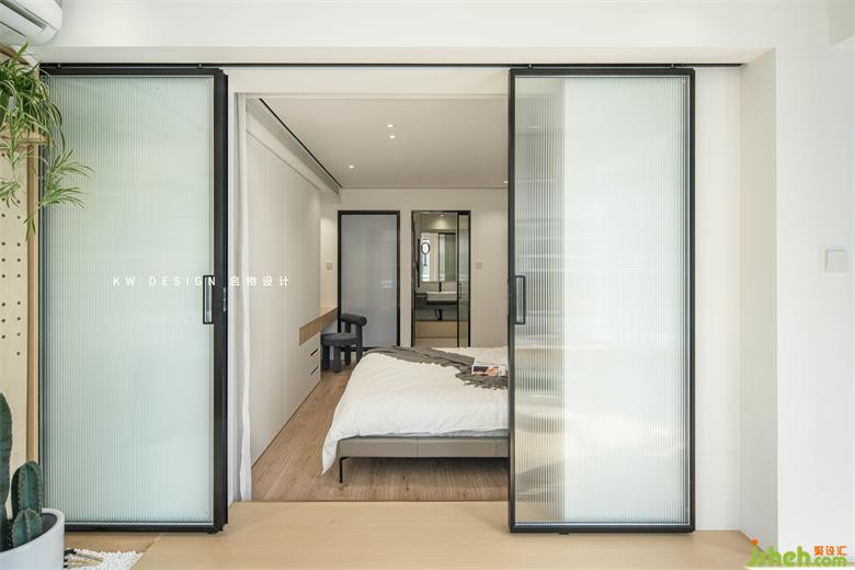 陽(yáng)光房看向臥室。長(zhǎng)虹玻璃的移門采用吊軌,深圳家裝設(shè)計(jì)留定位器可控制開合距離。