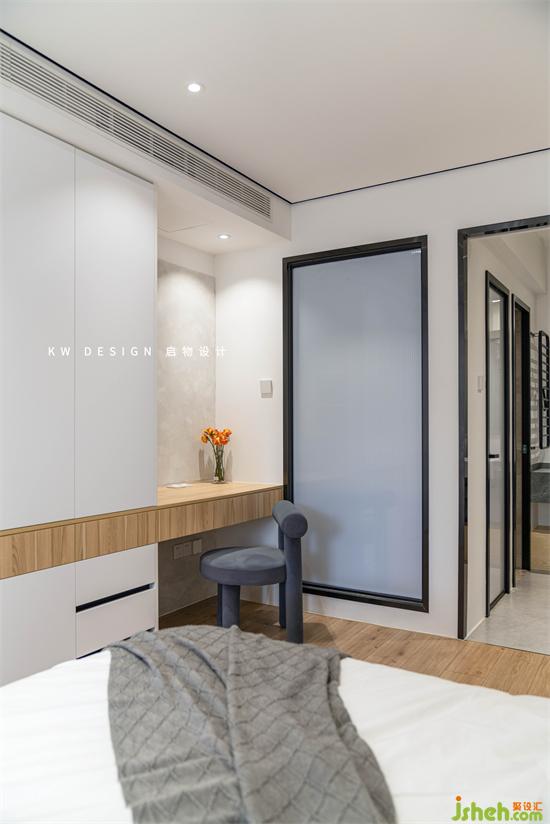 房門為了平齊客廳收納柜多與房間的過渡增加了四十公分,深圳家裝設(shè)計(jì)即使開著門也不會(huì)見著床,保證隱私。