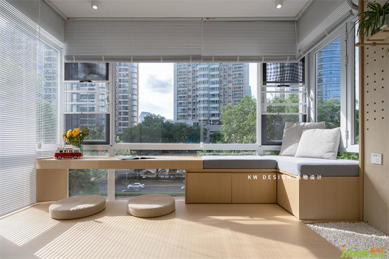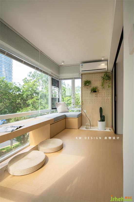 深圳家裝設(shè)計(jì)被陽光與自然包圍的多功能房作為S小姐寫作,閱讀,瑜伽,回血的地方,靠窗的3米平臺一半架空可以放腳當(dāng)書桌,一半下方做儲物抽屜,上方放墊子靠枕可坐,可臥。