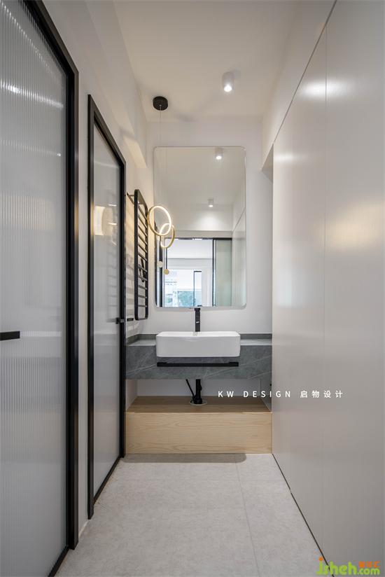 臥室和主衛(wèi)的過渡增加了移門,平時(shí)可以關(guān)起來避免對著床。右邊衣柜放常換洗衣物,中間的洗手臺分別設(shè)置擦手和貼身用的毛巾位置。深圳家裝設(shè)計(jì)根據(jù)生活習(xí)慣設(shè)置的主衛(wèi)間,好用好看好打理。