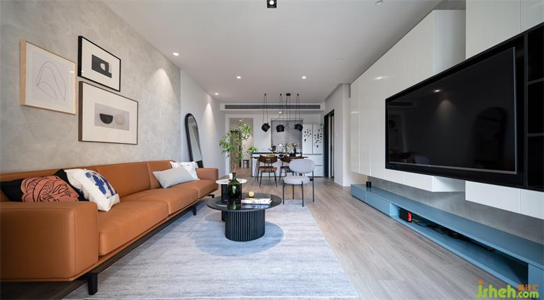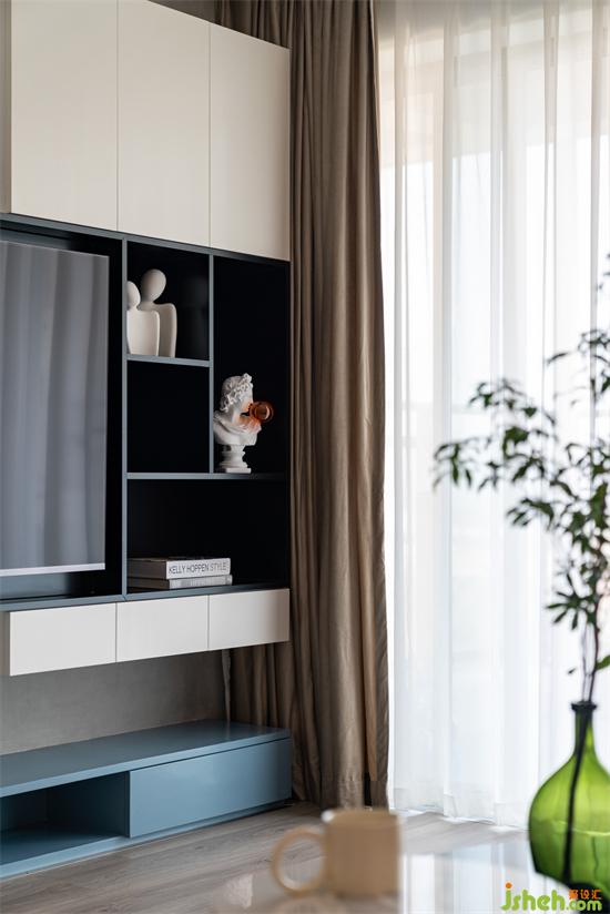 大電視柜隆重氣派,是一個隱藏式的集中收納區(qū)。為了不顯厚重,柜體沒有到頂。采用了斷裂、鏈接加懸浮的方式,靈巧又很有結構美感。