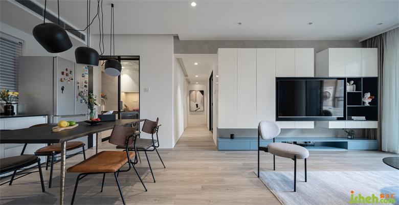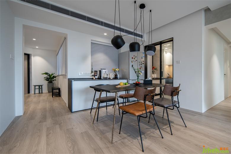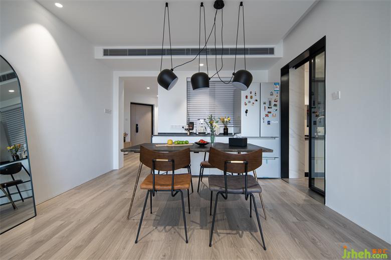 與客廳相比,餐廳的比重偏小,選用一款比較隆重的吊燈,抓人眼球,用餐也很有儀式感。聯(lián)和餐邊柜,冰箱這里組合成了一個輕食區(qū),偶爾下午還可以在這里喝喝咖啡,吃吃甜點。