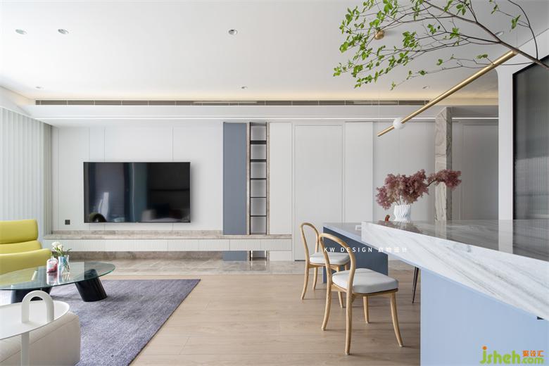 靠近廚房的墻面局部用長(zhǎng)虹玻璃和柜體替代,豐富空間感,提高通透度。