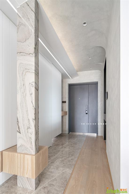 大理石長(zhǎng)柱體類似雕塑感羅馬柱在極簡(jiǎn)風(fēng)中的簡(jiǎn)化。家裝設(shè)計(jì)和原木塊體的穿插設(shè)計(jì)豐富空間感也可以強(qiáng)化玄關(guān)感受。
