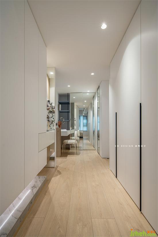 大理石地臺的設(shè)計除了豐富空間材質(zhì)感受以外也是為了強化柜體的懸挑感受。利用兩邊的隱形柜體將走道納入衣帽間形成更寬闊的開放式衣帽間。