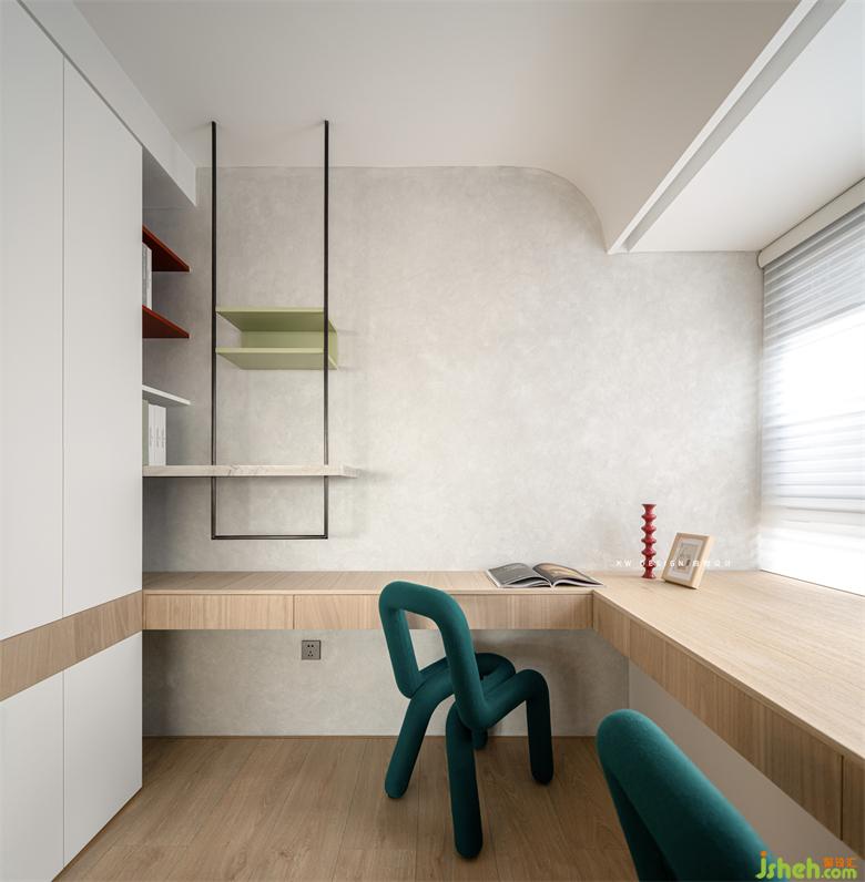 家裝設(shè)計將靠近客餐廳公區(qū)的小次臥改造成美貌的書房,飄窗兩人位書桌延展至書架,這樣可以拓展書桌的使用區(qū)域,旁邊可以放一些書籍。