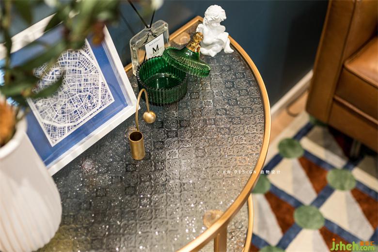北歐表情的棕色沙發(fā)搭配落地銀色銅燈,精致唯美。家裝設(shè)計拼色幾何地毯幾乎搭上了客餐廳空間的所有色系,仿佛一個集大成者。墻面蔚藍(lán)色半墻浮上圓形橙色色塊,不禁讓人聯(lián)想到蔚藍(lán)的海面,燃燒似火,懸浮其上的落日,浪漫愜意。創(chuàng)意給空間加分。