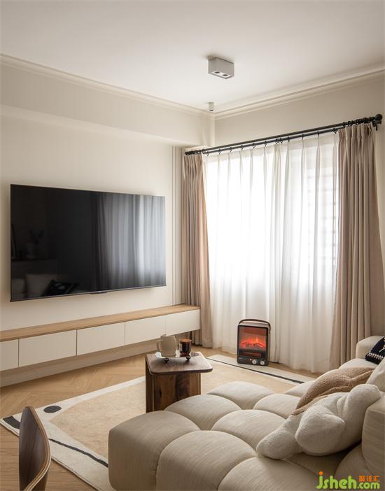 4. 客廳考慮徑深對(duì)觀影舒適度的影響,沙發(fā)沒(méi)有沿墻擺放,同時(shí)與墻體收納位置的間隔讓空間更加有透氣感,也無(wú)形增加了一個(gè)實(shí)用且儀式感的玄關(guān)空間。