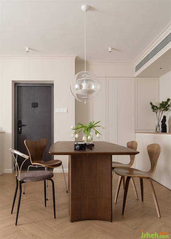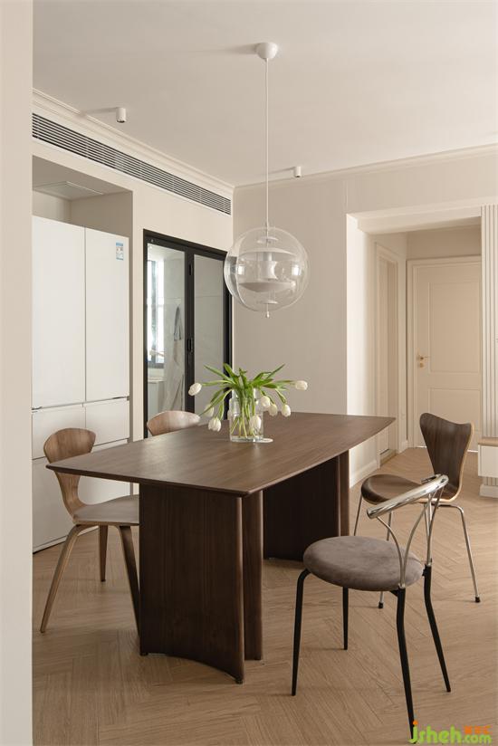 公領(lǐng)域唯一的主動是餐廳的星球吊燈,透明輕盈的球星框架搭配內(nèi)部金屬片,宛如無重力的空間漂浮,景新花園家裝設(shè)計搭配中古餐桌和不同形態(tài)的餐椅,一深一淺,一實一虛,一方一圓,簡單也豐富,多樣也統(tǒng)一。