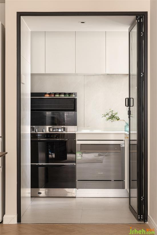 餐廳與廚房砌了一面薄墻使餐邊柜和冰箱呈內(nèi)嵌狀態(tài),景新花園家裝設(shè)計削弱收納的厚重體量,同時也拓展了廚房的徑深騰挪出折疊推門的收納位置,而不影響廚房的正常使用。