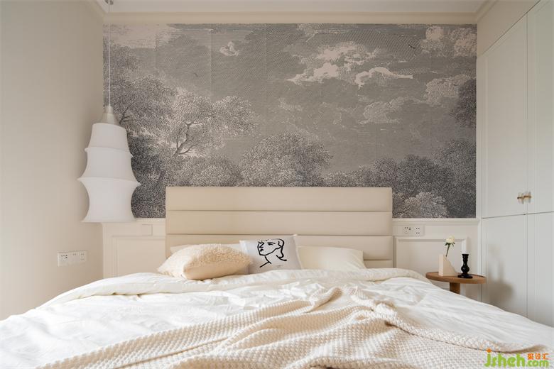 臥室床頭復(fù)古法式風(fēng)情壁紙,景新花園家裝設(shè)計(jì)以高雅藍(lán)白調(diào)為底,展現(xiàn)溪澗山林與白云的自然景色,給與素雅空間心曠神怡的透氣感和耐人尋味的故事感。
