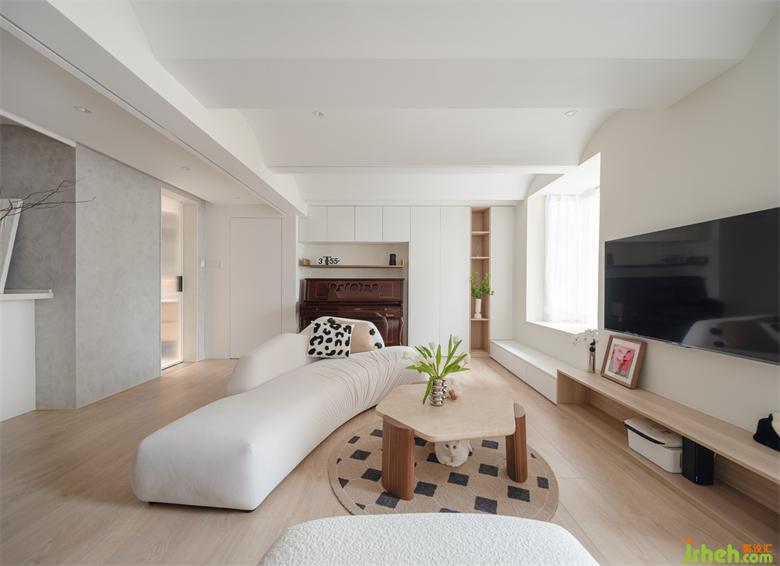 客廳的功能家具面向窗戶布置,圓潤的形體圍合無邊界的休閑活動(dòng)區(qū)??紤]窗臺比較高增加一圈地臺可收納可坐,高中低不同高度的收納設(shè)計(jì)貼合使用者不同的的拿取和整理習(xí)慣,爛泥們爬上窗臺看風(fēng)景也方便多了。