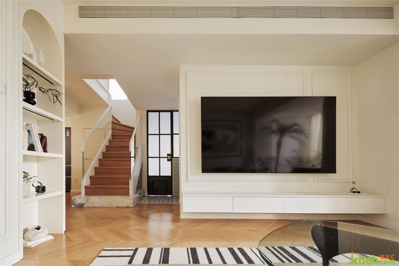 原先由餐廳到客廳的轉彎處是兩個拐角相沖,過道擁擠,把長輩房進門位置內進后擴大了轉角空間,佳兆業(yè)悅峰復式裝修設計一側做弧形開放層板,另一側做懸挑柜補充客廳收納,弱化生硬轉角,舒適順暢的生活動線也得以釋放。
