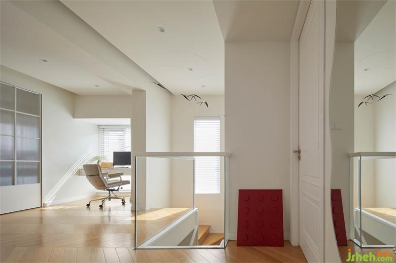 靠窗凹位定制書桌作為羊羊和先生臨時辦公的區(qū)域,旁邊空位預留壁燈作閱讀角。佳兆業(yè)悅峰復式裝修設計紅色裝飾點綴能很好調動小朋友的情緒,增加活力。兼具陪伴與互動的空間幫助小朋友成長。