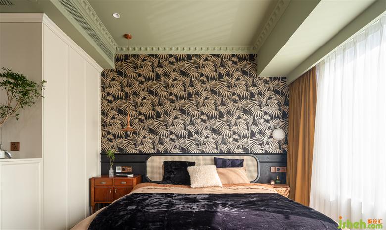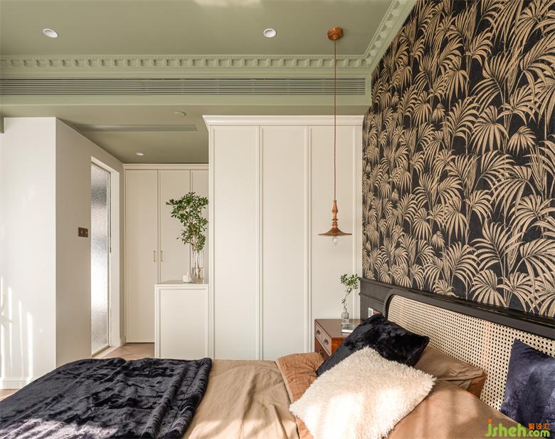 睡眠空間用色更加跳脫大膽,南洋風(fēng)不可缺少的清涼與熱烈由墻至頂大面積渲染,床頭背景采用黑白相間的棕櫚葉裝飾壁紙,抹茶綠鋪陳天花,具象的綠意與夢幻的香薰裝點(diǎn)其中,為空間注入大自然的生機(jī)以及探索的神秘感。